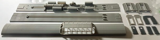 This kit includes a Budd Dome Roof, either plain or generic detailed floor, a vestibule partition, Budd diaphragm extensions, Budd ends, 2 solid doors and 2 doors with windows. Window glass is included.